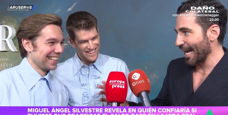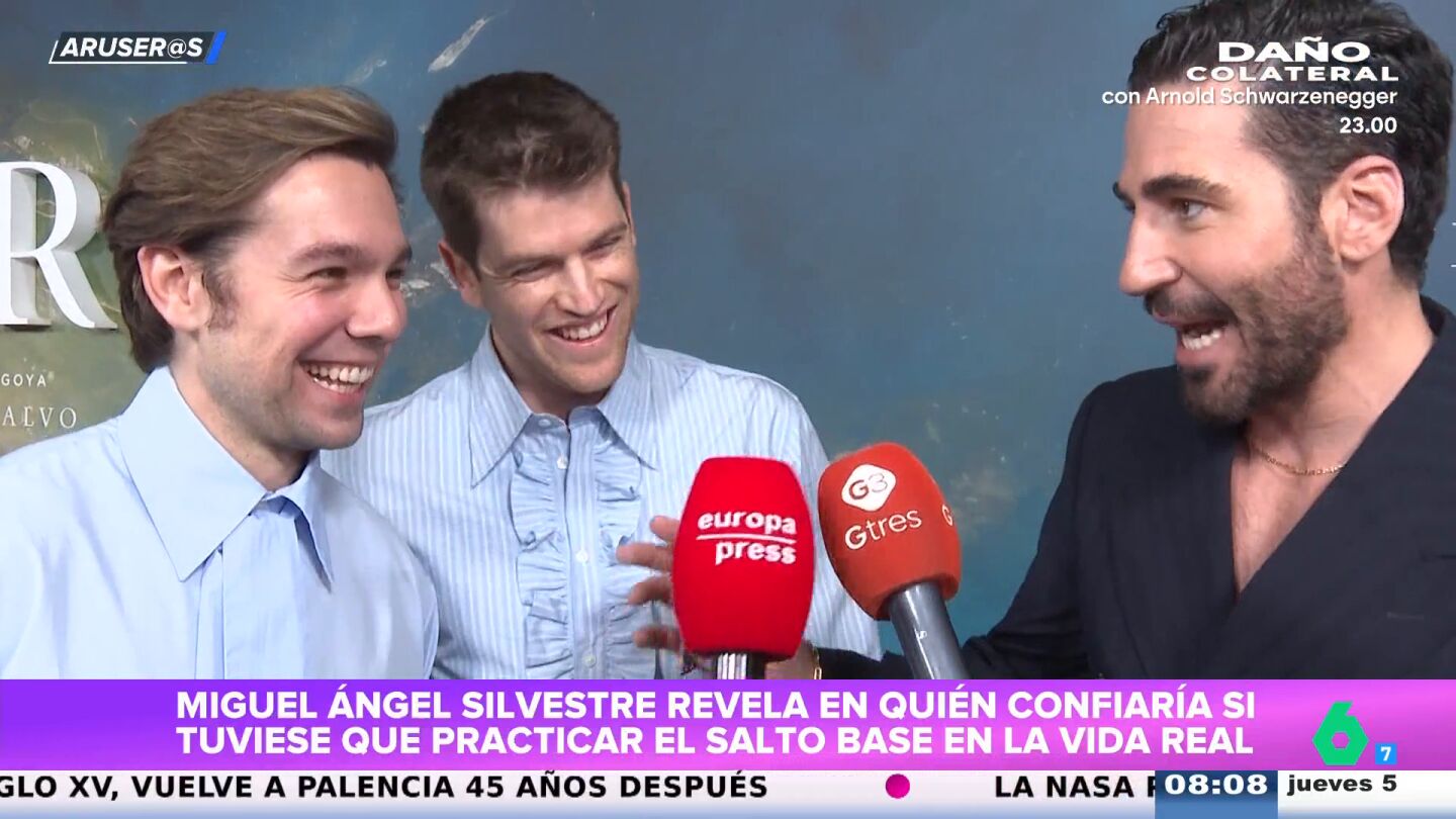 Miguel Ángel Silvestre, Miguel Bernardeau y Carlos Cuevas han estrenado 'La Fiera' en Madrid. Se trata de una película, de Atresmedia Cine, basada en la historia real de los pioneros del salto BASE con traje de alas en España. Los actores han sido preguntados sobre con quién se decidiría a hacer salto base en la vida real. "Lo haría con cualquiera de estos dos compañeros porque aunque son más jóvenes que yo, son más hermanos mayores porque son muy responsables", afirma Alfonso Arús, algo que comparten sus compañeros.