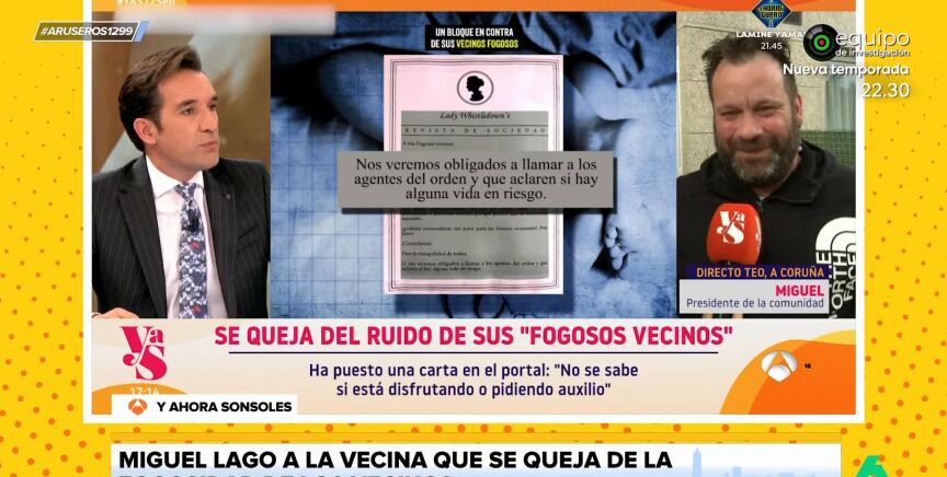 En 'Y ahora Sonsoles' han entrevistado al presidente de una comunidad de vecinos que ha recibido una nota de una vecina quejándose del ruido que hacen sus "fogosos vecinos". Este es el 'dardo' que lanza Miguel Lago a la vecina "envidiosa".