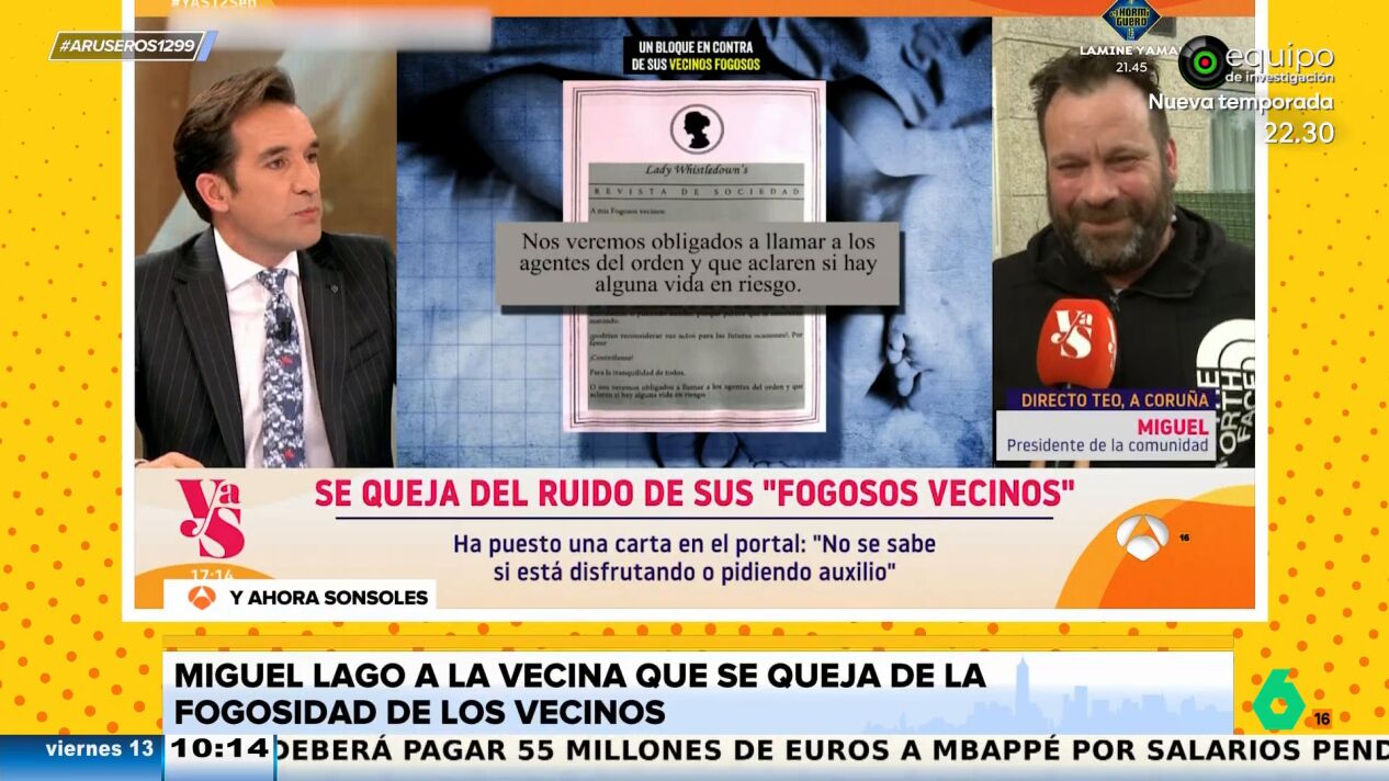 Alfonso Arús presenta el 'dardo' que lanza Miguel Lagoen el programa de 'Y ahora Sonsoles' a la vecina que se ha quejado del ruido que hacen sus "fogosos vecinos". La presentadora del programa está entrevistando al presidente de la comunidad cuando, de pronto, le pregunta si conocen a la pareja de "fogosos" y quién es la "envidiosa" que ha dejado la queja en una nota en el portal.
