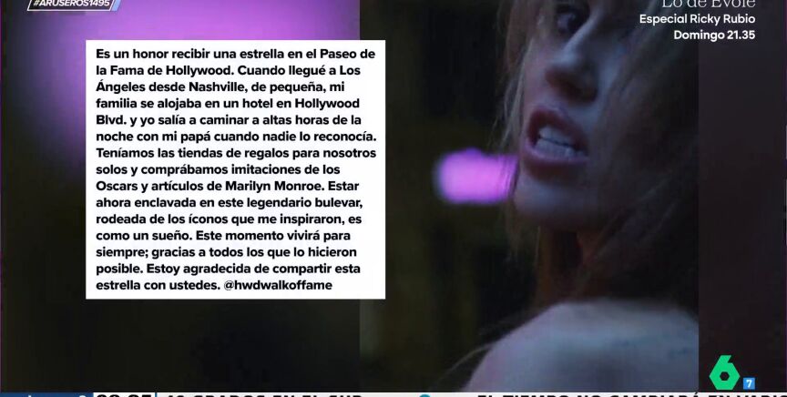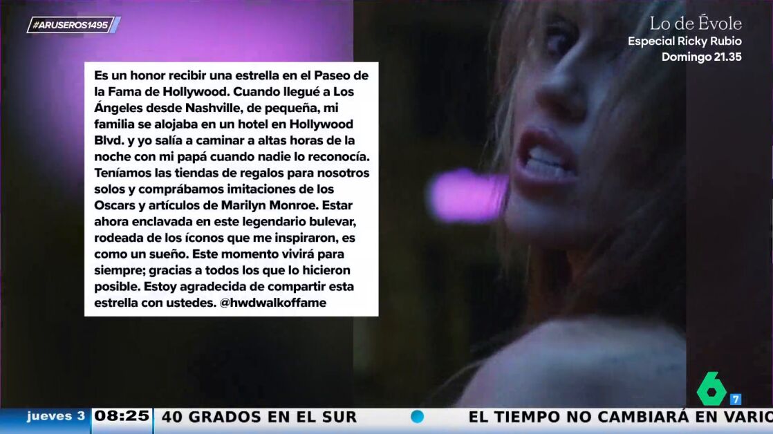 "Es un honor recibir una estrella en el Paseo de la Fama de Hollywood. Cuando llegué a Los Ángeles de pequeña desde Nashville, mi familia se alojaba en un hotel de Hollywood Blvd y yo salía a pasear con mi padre por la noche, cuando nadie le reconocía. Teníamos las tiendas de regalos para nosotros solos y comprábamos imitaciones de los Oscar y artículos de Marilyn Monroe. Estar ahora en este bulevar legendario, rodeada de los iconos que me inspiraron, es como un sueño. Gracias a todos los que lo han hecho posible. Estoy agradecido de compartir esta estrella con vosotros", ha publicado en su perfil de Instagram.Desde el plató de Aruser@s, Alfonso Arús aplaude a los nuevos protagonistas del Paseo de la Fama, pero asegura que "luego vas allí y la calle está fea y está todo lleno de chicles".