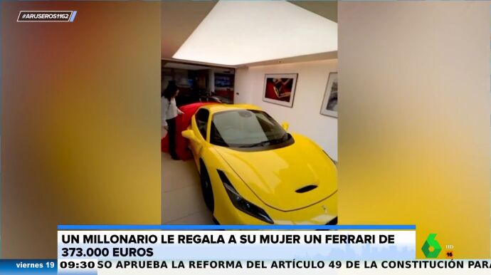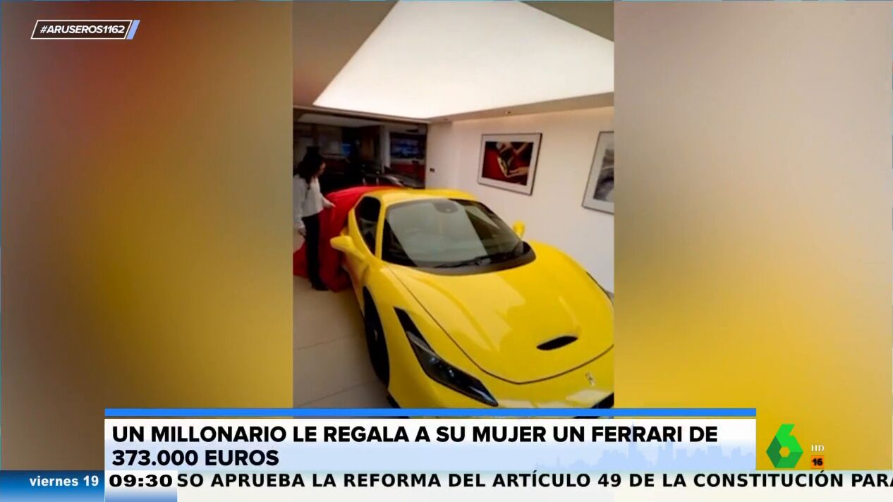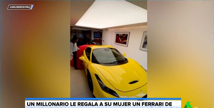 No ponemos en duda que un Ferrari es un regalazo como la copa de un pino, no nos malinterpretéis. Pero en Aruser@s nos resulta algo sospechoso estos gestos tan grandilocuentes que a veces tienen las parejas. En este vídeo viral emitido en el programa somos testigos del momento en el que una mujer descubre que su marido le ha regalado este cochazo, valorado en 375.000 euros.