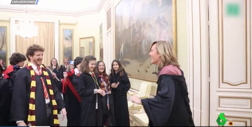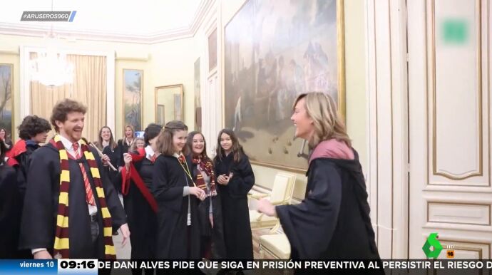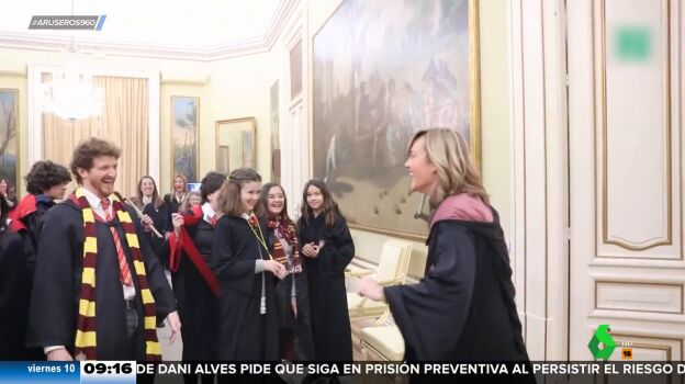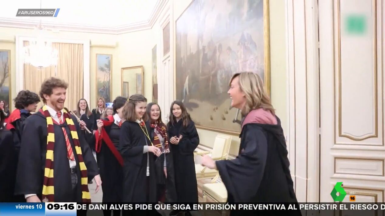 La ministra de Educación, Pilar Alegría, ha ejercido de ministra de la Magia en un acto con escolares celebrado en la sede del Ministerio, convertido en la escuela de Hogwarts, tal y como puede verse en este vídeo de Aruser@s.