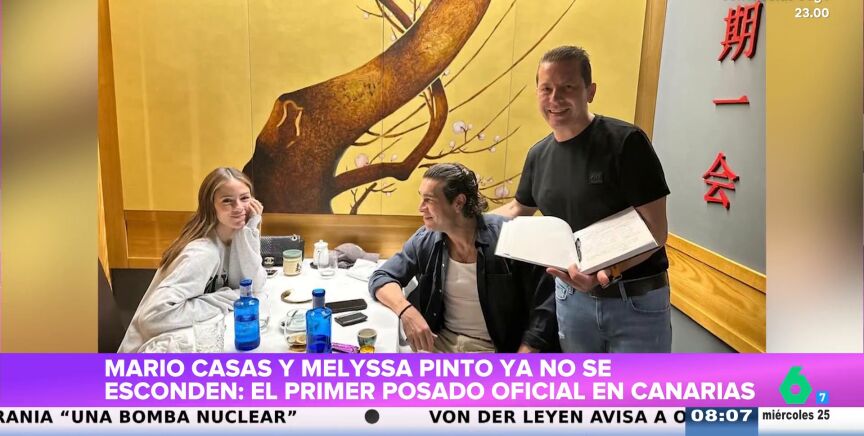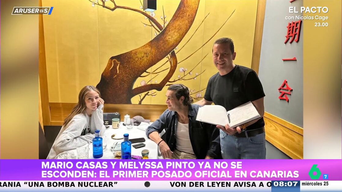 Mario Casas y Melyssa Pinto ya no se esconden y, tras un año de relación muy hermética, la pareja ha viajado a Canarias, donde han sido fotografiados de ambos cenando en el restaurante 'Fuji'. "Todas las fans de Mario y Melyssa se fijaban en la mirada embelesada que tiene el actor con la influencer", afirma Tatiana Arús, que explica que las fans dicen: "Búscate un chico que te mire como Mario mira a Melyssa".