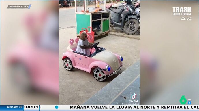 "Me encantan estos vídeos que se están viralizando ahora del mono que conduce", manifiesta Alfonso Arús, que afirma que el animal parece que lleva "el coche de la Barbie". En las imágenes se puede ver cómo un mono llega en un coche de juguete a un supermercado. El mono que lleva un vestido baja y le entrega dinero a un hombre. El primate coge su compra, vuelve a su auto y se va.