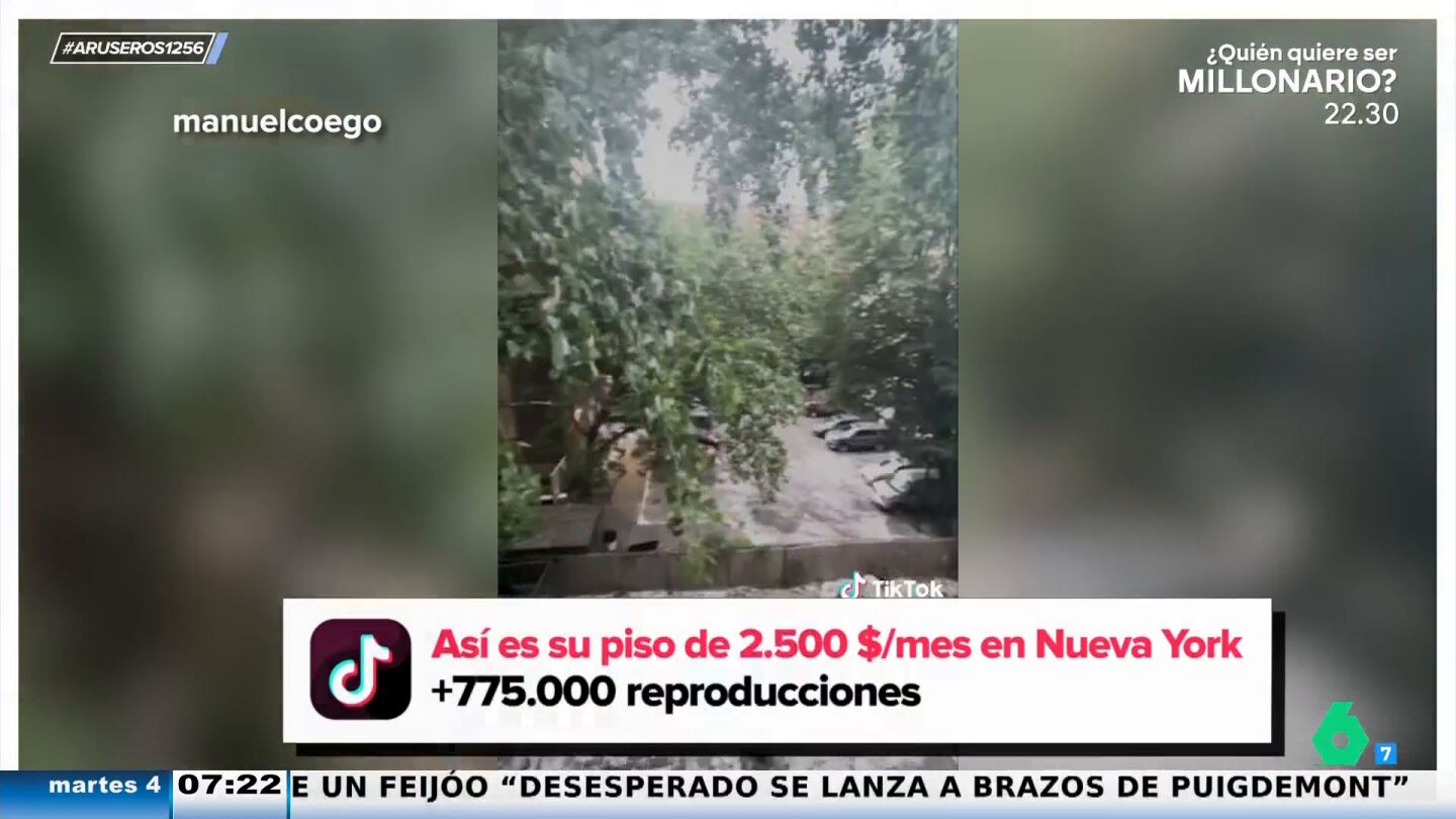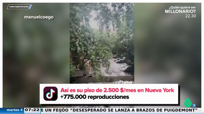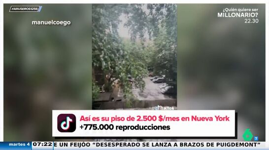 El conductor del programa vuelve a destacar que el piso tenga vistas a árboles estando en Nueva York. "Parece el Amazonas", bromea Alfonso Arús. Rocío Cano explica que la ciudad estadounidense es muy cara. "Ya un cuchitril como este es una pasta, pero ya no es solo el alojamiento, el comer, el tren, el metro... es mucho dinero", expone la tertuliana.