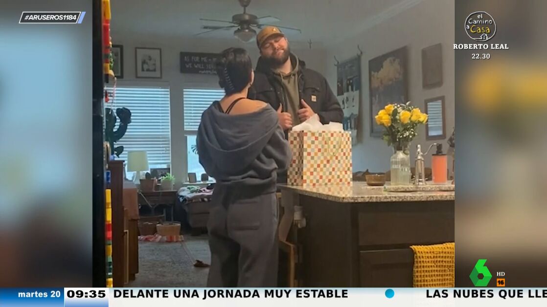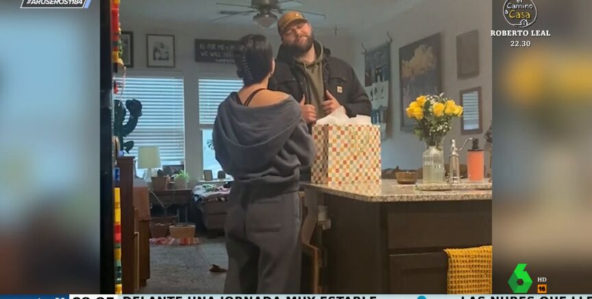 Para ello, ha envuelto el test de embarazo positivo y lo ha colocado en una enorme caja de regalo. Cuando el hombre lo abre, se derrumba por completo. A los pocos segundos, ambos se funden en un abrazo de esos que ponen un nudo en la garganta.