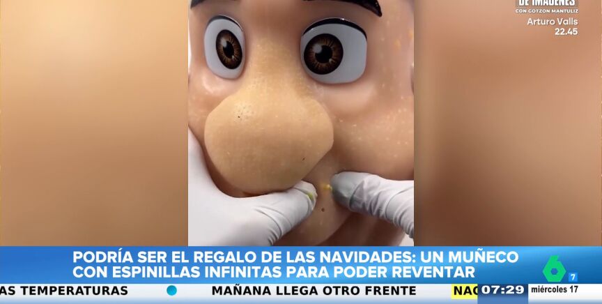 Para muchos, reventar espinillas es algo relajante y gracias a este muñeco ya no tendrán que buscar víctimas entre sus seres queridos para liberarse del estrés. "Garantizan que tiene infinitas", comenta Alfonso Arús. "Al apretar sale como un chorrito que es una silicona que, si la dejamos estar, se reabsorbe", explica la periodista.