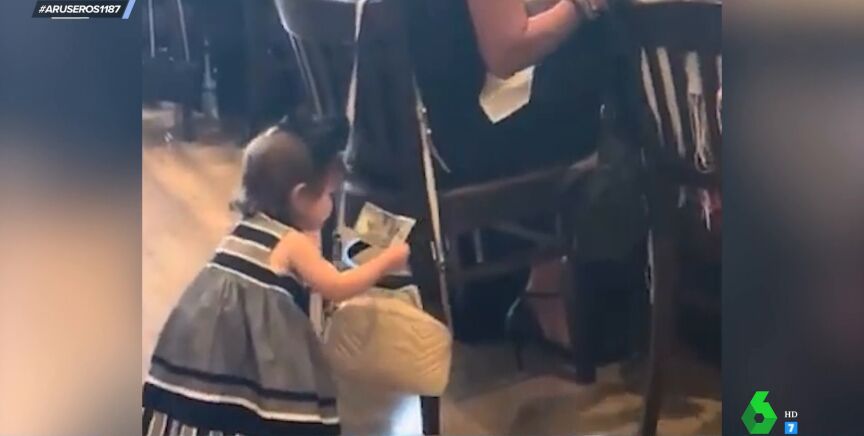 Y todo ello, "con esa cara de buena nieta", añade Alfonso Arús mientras ve este vídeo viral emitido en Aruser@s. "Tiene tan solo 17 meses" informa el presentador. "Cuidado con la niña, que no empiece a buscar dinero también en los bolsos del resto de comensales del restaurante, porque parece el mono ese que hay por ahí que choriza los móviles", apunta Angie Cárdenas.