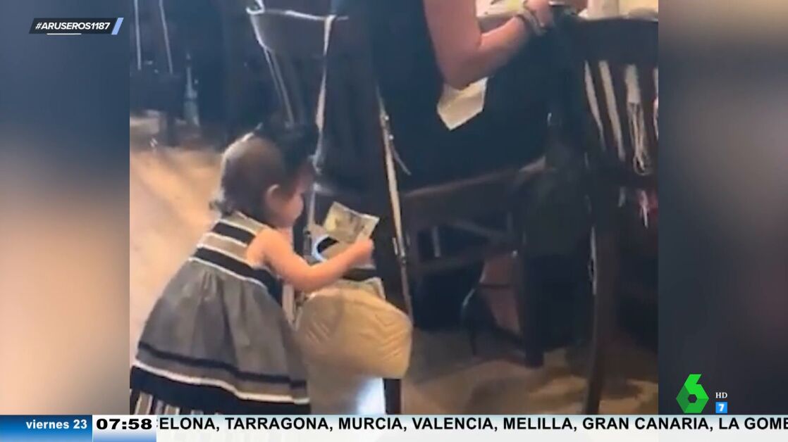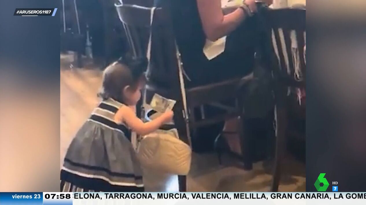 "Cuidado con la niña, que no empiece a buscar dinero también en los bolsos del resto de comensales del restaurante, porque parece el mono ese que hay por ahí que choriza los móviles", observa Angie Cárdenas al ver este vídeo viral.