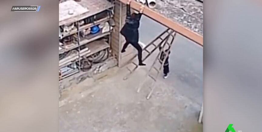 Esta señora sufre un pequeño percance y las escaleras en las que se estaba apoyando, caen al suelo. Ella se queda colgada de la parte superior de la puerta del garaje y no se atreve a soltarse. Por suerte, su nieta, que presencia toda la escena, reacciona con rapidez, tal y como podemos ver en estevídeo viralemitido en Aruser@s.