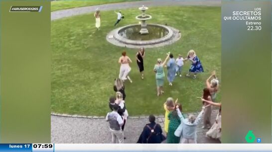 El pequeño, al ver que consigue el ramo sale corriendo intentando esquivar a muchas de las invitadas que intentan pararlo. Una de ellas se tropieza y cae al suelo, causando risas entre las allí presentes.