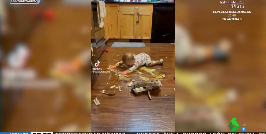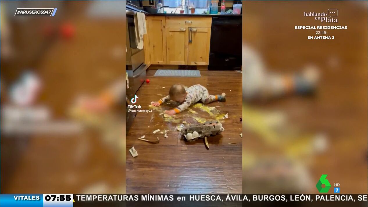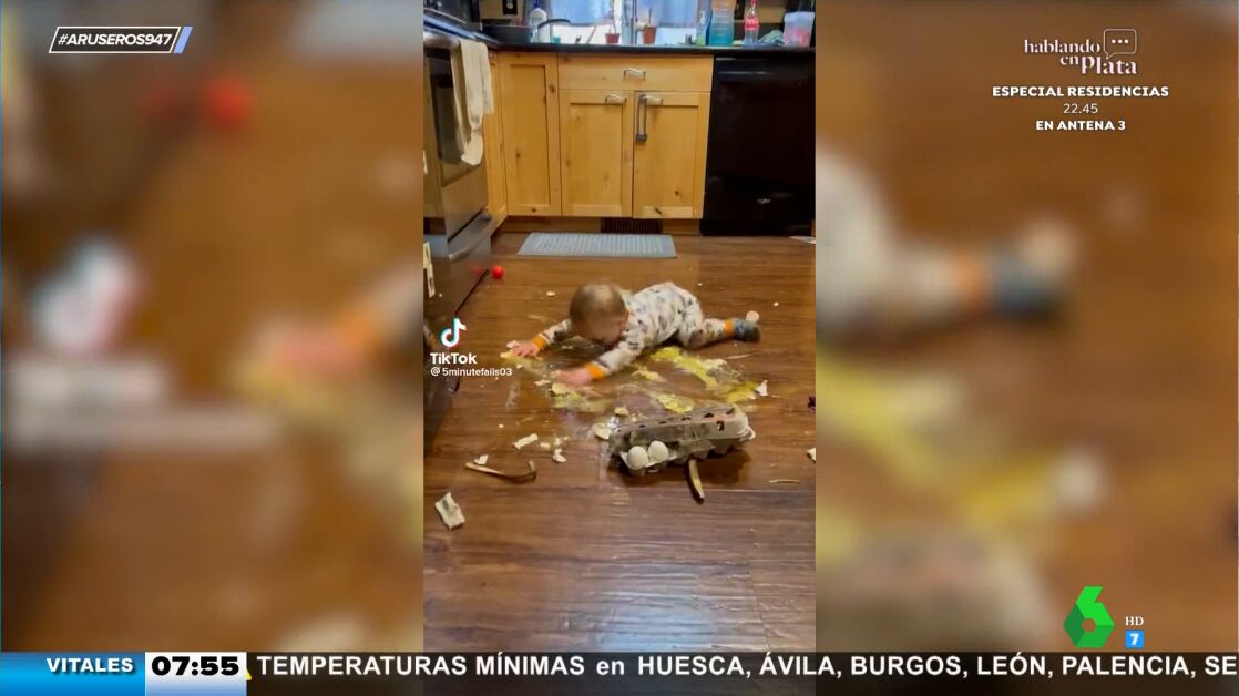 Este pequeño ha revolucionado la cocina de su casa tirando todos los huevos al suelo y formando a sus pies una pre-tortilla gigante.