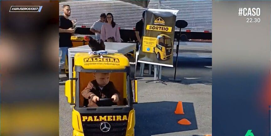 El ídolo de Alfonso Arús, el "bebé campero" vuelve a protagonizar un vídeo viral junto a su gallina. En las imágenes se puede ver al pequeño subido en un camión circulando entre conos demostrando su habilidad con el tráiler. El niño hace todo esto acompañado de su gallina, solo que el ave no está en el asiento del copiloto, está en el techo de la cabina.