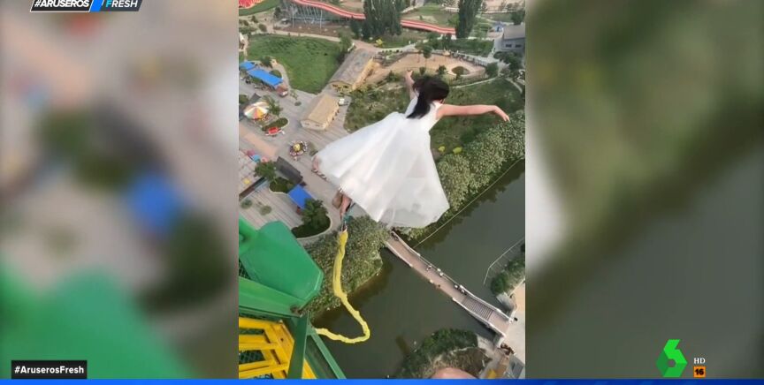 Esta estresada novia decide hacer 'puenting' el mismo día de su boda para aliviar la ansiedad que tan señalado día le produce. Esperamos que haya firmado los papeles antes de lanzarse al vacío.