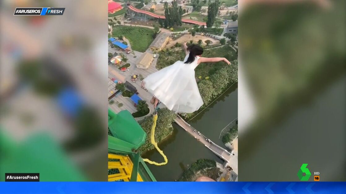 ¿De verdad es el mejor día para practicar deportes de riesgo? La joven que vemos en este vídeo decidió hacer 'puenting' el mismo día de su boda, con vestido de novia incluido, con el fin de liberar tensiones. Las imágenes son, al menos, elegantes.