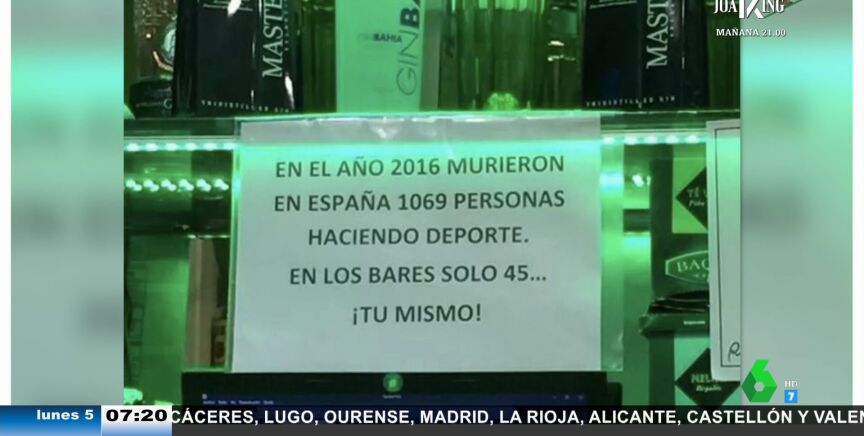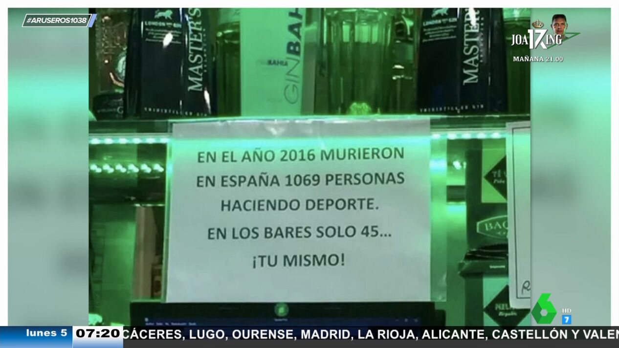 "Orina dentro, que el que limpia el baño es el que hace los pinchos", lee Hans Arús entre las exclamaciones de sus compañeros. Este otro nos ofrece un dato que no podemos comprobar en este momento, pero que al menos, sirve para su objetivo: "En el año 2016 murieron en España 1069 personas haciendo deporte. En los bares, solo 45. ¡Tú mismo!".
