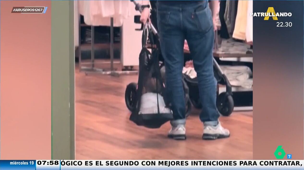 Una bolsa de rejilla negra y grande, típica de algunas tiendas de ropa, y paciencia para estar balanceado una y otra vez al hijo, es el nuevo método casero que utiliza un padre para columpiar al niño. Tal y como podemos ver en este vídeo de Arusder@s, el padre se pasea por la tienda mientras columpia a su hijo en el 'balancín casero'.