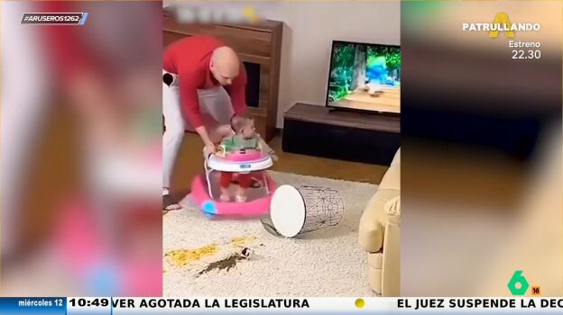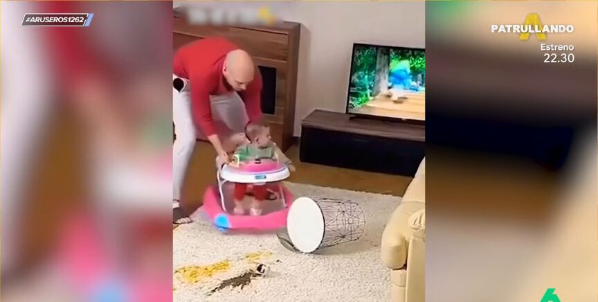 Alfonso Arús reproduce un viral vídeo en el que un padre le eche la culpa a su hijo por algo que lía el adulto. A este hombre se le cae la comida en el salón dejando la alfombra absolutamente perdida. El chico para que su mujer no le eche la bronca decide mover a su bebé cerca del lugar del suceso para hacer ver que ha sido el niño.