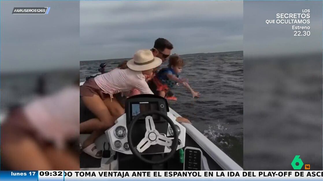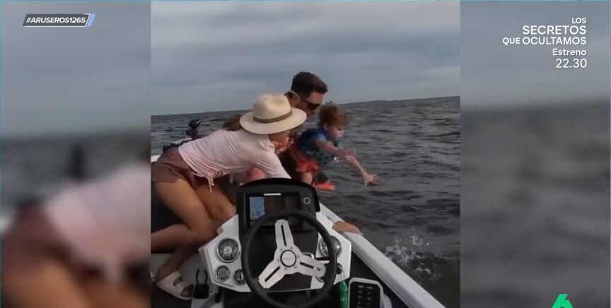 Un familiar graba el precioso instante en el que estando en una excursión de pesca, el padre se resbala en la lancha con mala suerte de tropezarse y tirar a su hijo al mar. Gracias a la rápida reacción tanto del padre como de la madre, que rescatan a su hijo al momento, la anécdota queda en un susto.