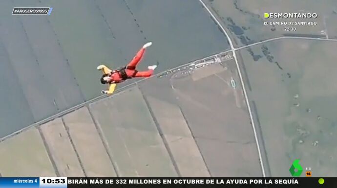 Por fortuna, su instructor se lanza en picado a ayudarla y consigue llegar hasta ella y activar su paracaídas para salvarle la vida. "En estos momentos debes pensar seguro 'es mi final'", comenta el presentador de la sección de deportes del programa.