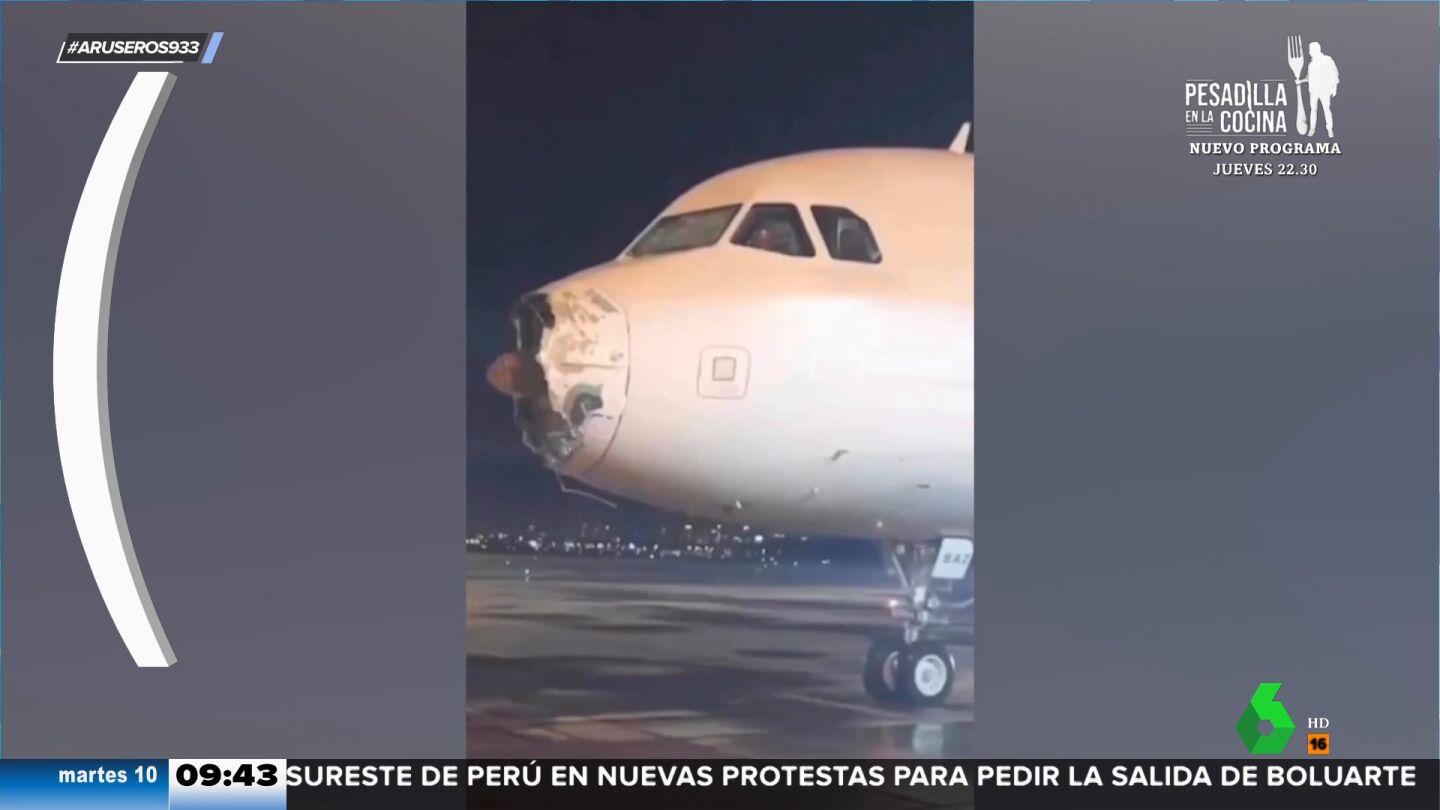 Tal y como se puede ver, el aparato sufrió "daños importantísimos en la parte delantera", informa Alfonso Arús. El avión se disponía a aterrizar en Asunción (Paraguay) cuando ocurrió este incidente.
