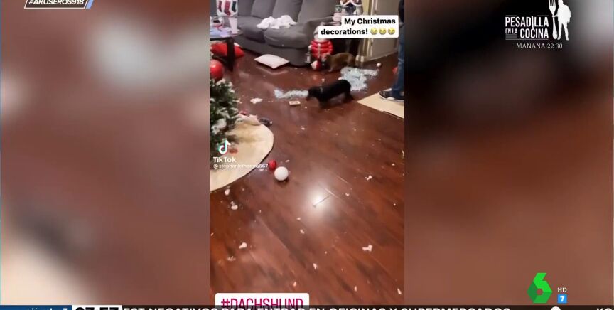 Este es el caso de estos dos canes, que han organizado un auténtico destrozo por toda la casa, en la que no sobreviven ni el espumillón, ni las bolas, ni siquiera los juguetes. Su dueña les riñe muy enfadada, pero a ellos parece no importarles en absoluto lo que les está diciendo la mujer, como podemos ver en este vídeo de Aruser@s.