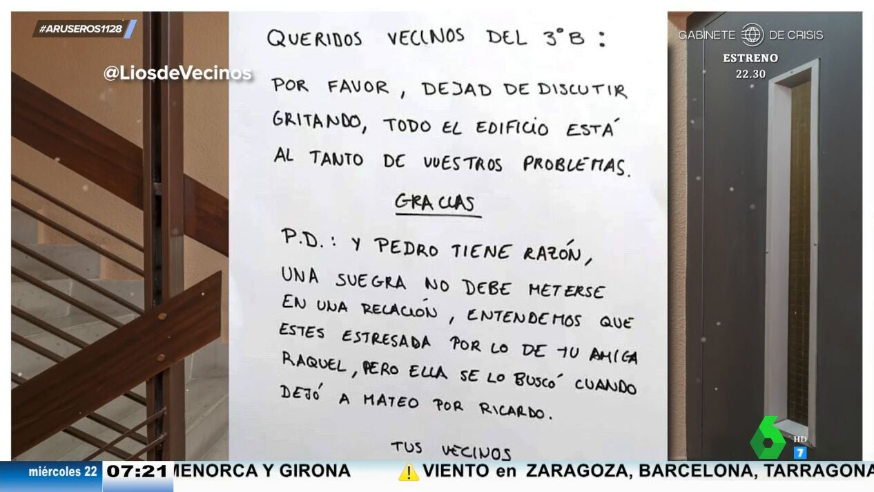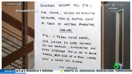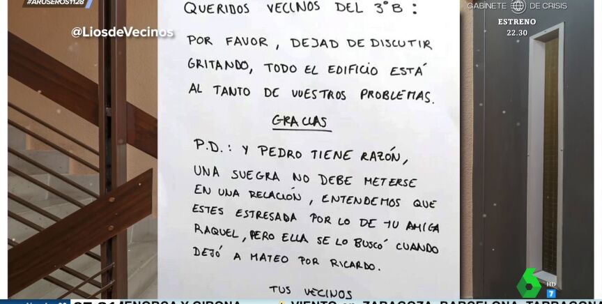 "Queridos vecinos del 3ºB: por favor, dejad de discutir gritando. Todo el edificio está al tanto de vuestros problemas", piden amablemente en una nota colgada en una zona común los vecinos de un edificio a los ocupantes de ese apartamento en concreto, como podemos ver en este vídeo de Aruser@s. Hasta aquí, podría parecer una advertencia al uso, típica de cualquier comunidad.