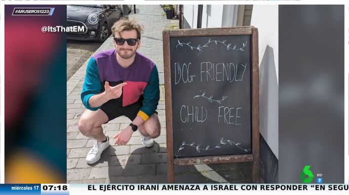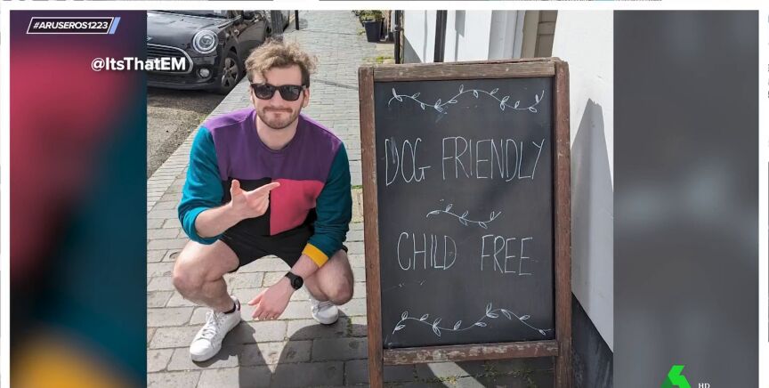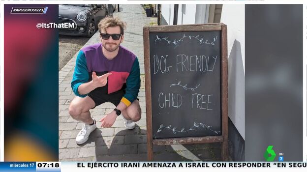 "¿Cuántas veces hemos hablado de preferir sentarse con animales o niños cerca?", recuerda Hans Arús, que enseña en el plató de Aruser@s el cartel viral de una cafetería que anuncia que los perros tienen la entrada permitida, pero los niños no. "Yo me reafirmo con mi idea de preferir estar cerca de un animal", destaca Hans Arús, que afirma que en el vuelo de vuelta desde Galicia le tocó "el típico niño que no dejó de llorar en la parte de atrás".
