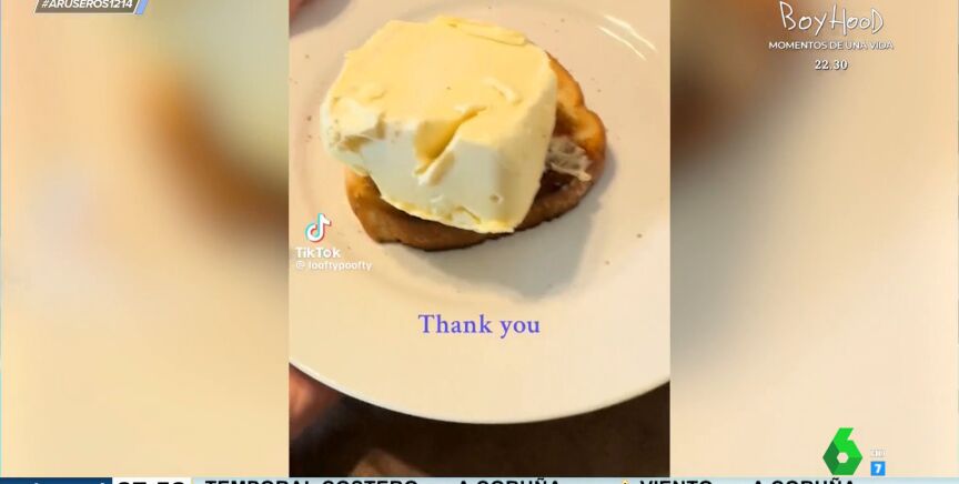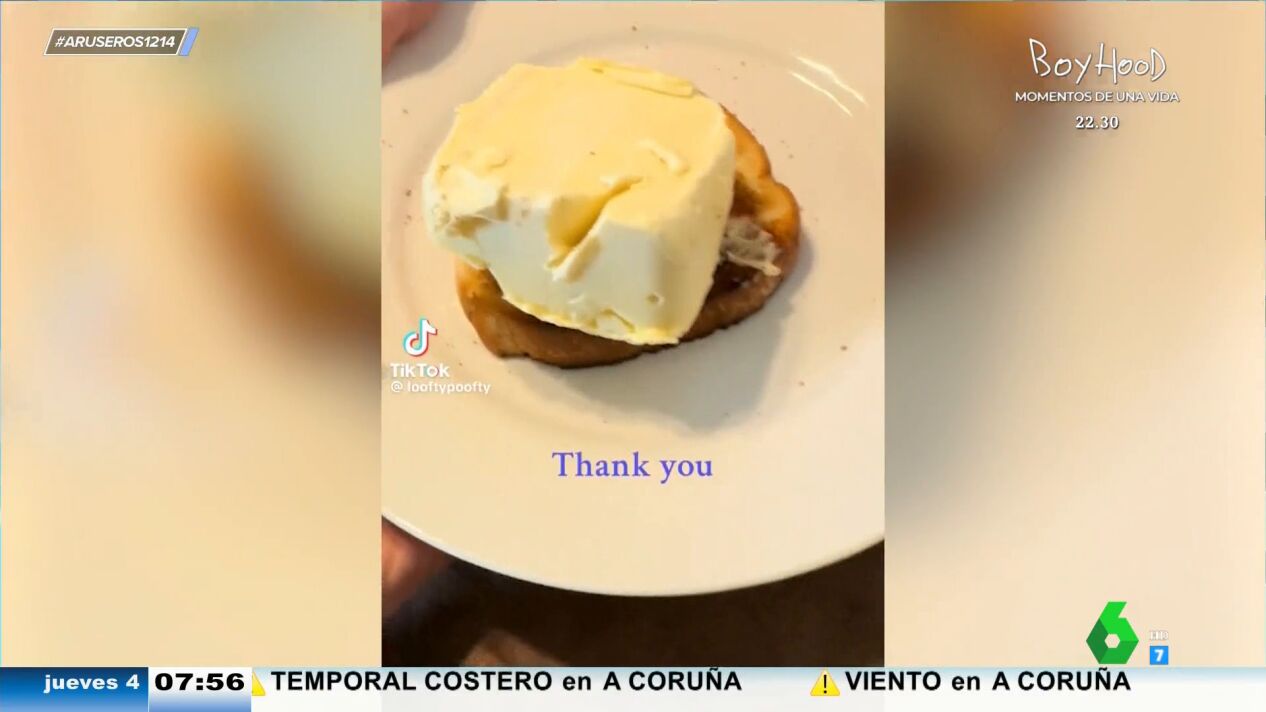 ¿A quién no le gusta que le sirvan? La usuaria de TikTok @looftypoofty ha compartido en su cuenta el desayuno que le ha preparado su hija. En el vídeo se puede ver como la pequeña le lleva un plato de mantequilla con tostada. La niña aparece con una tostada con medio paquete de mantequilla encima.