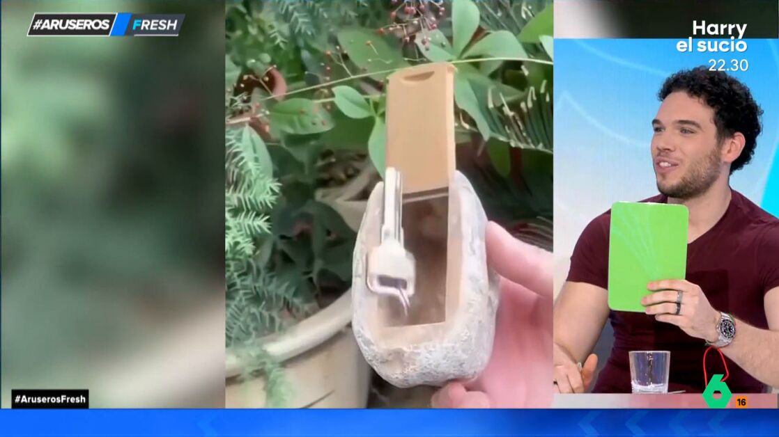 Alfonso Arús mostraba a los tertulianos durante la temporada pasada de Aruser@s un invento para mejorar sus vidas. Todo el mundo ha dejado las llaves a alguien cuando no está en casa para abrirles y se han quedado debajo del felpudo o encima del buzón, y el presentador traía la solución, una piedra falsa para dejar las llaves.