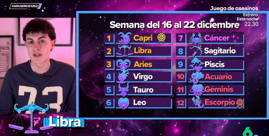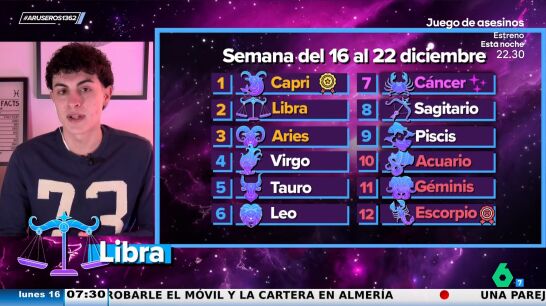 El ranking de esta semana del 16 a 22 de diciembre lo encabezan tres signos: Capricornio, Libra y Aries. La energía positiva, la suerte y la intuición están de vuestro lado. En el puesto mágico tenemos a Cáncer. Sin embargo, Acuario, Géminis y Escorpio no estaréis con tanta suerte. En el vídeo sobre estas líneas puedes escuchar lo que tiene que decirte el astrólogo para que afrontes la semana llena de energía.