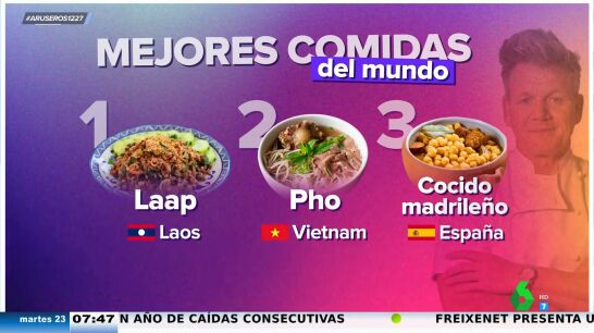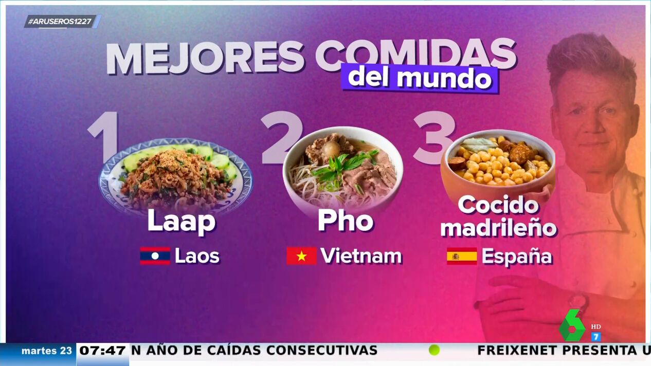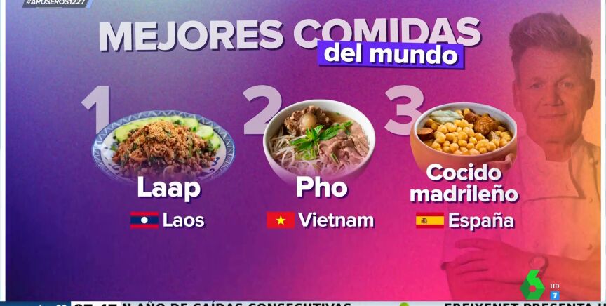 El prestigioso gastrónomo Gordon Ramsay ha elaborado una lista con las mejores comidas del mundo y, entre las tres primeras, se encuentra el cocido madrileño. Delante de este manjar típicamente español solo se encuentra el laap de Laos y el pho de Vietnam.