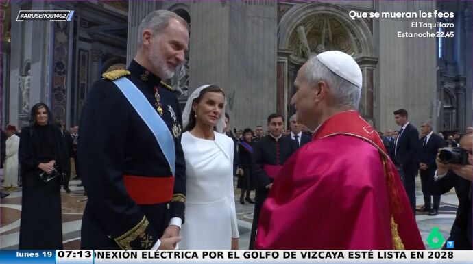Por otro lado, Tatiana Arús enseña en el vídeo principal de esta noticia el momento del saludo de los reyes de España al nuevo papa. "Apenas han sido 50 segundos pero, tal y como ha desvelado Casa Real, le han deseado toda la suerte del mundo y le han dicho que le esperan ver pronto en España", explica la colaboradora en el plató, donde Alfonso Arús afirma que "hasta ahora el papa ha sido un habitual porque ha visitado España en diferentes ocasiones" antes de convertirse en León XIV. "Espero que no se haga de rogar", afirma el presentador.