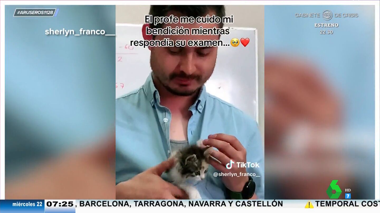 Este vídeo de TikTok tiene más de 10 millones de visualizaciones y nos parecen pocas. Durante un examen, un profesor vigila a sus alumnos mientras cuida al pequeño gatito de una de ellas. Una estampa adorable que va a enternecer tu día.