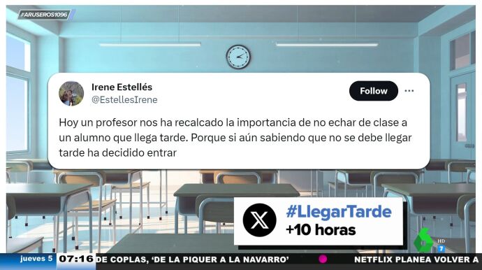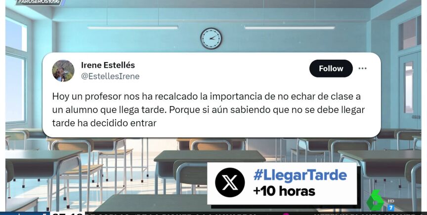 "Hoy un profesor nos ha recalcado la importancia de no echar de clase a un alumno que llega tarde", cuenta una chica en la red social 'X', antigua 'Twitter'. Según este docente, hay que dejarle entrar porque demuestra "interés". "Y si un alumno tiene interés en llegar a tu clase aunque sea tarde, ¿quién eres tú para prohibirle la entrada?", se pregunta, tal y como podemos ver en este vídeo de Aruser@s.