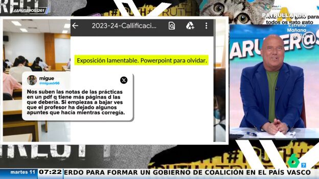 "Una cosa es que te pongan un tres, un cinco o un siete y otra saber que te lo ponen por exposición lamentable", opina Alfonso Arús, mientras que Alba Sánchez prefiere las verdades duras. "Una cosa es que te lo diga el profesor algo más suavizado y otra cosa es ver 'exposición lamentable'", le responde Tatiana Arús.