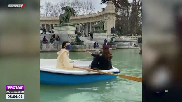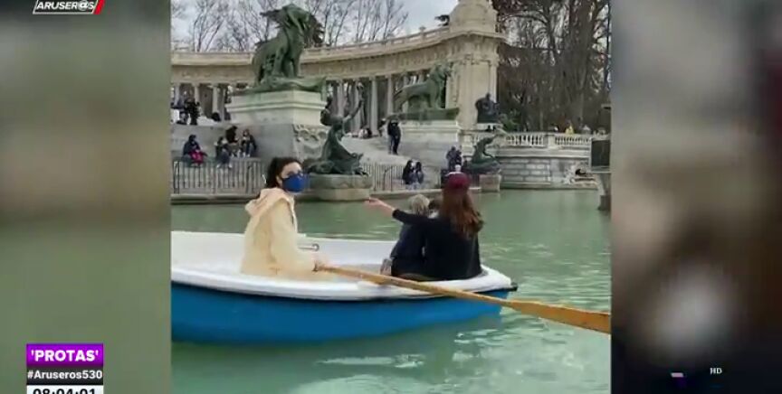 La presentadora y sus hijos montaron en las barcas del parque del Retiro, en Madrid, donde tuvieron que remar a toda velocidad para evitar que un barco más grande los arrollara. El momento, en este vídeo de Aruser@s.