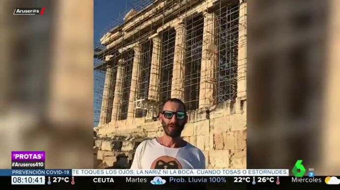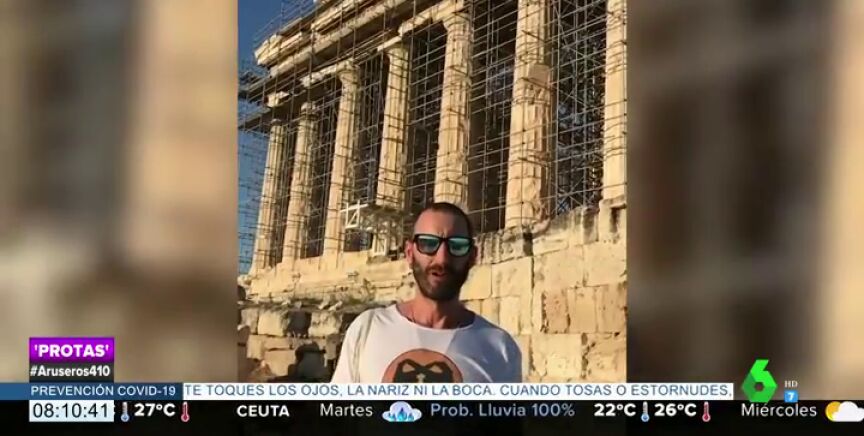"He venido hoy a la Acrópilis y esto es genial, lo que pasa es que está todo lleno de andamios. Bueno, todo no. Parte sí y Partenón", bromea en su visita a Atenas.