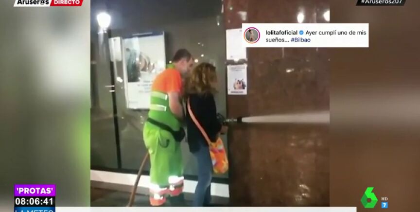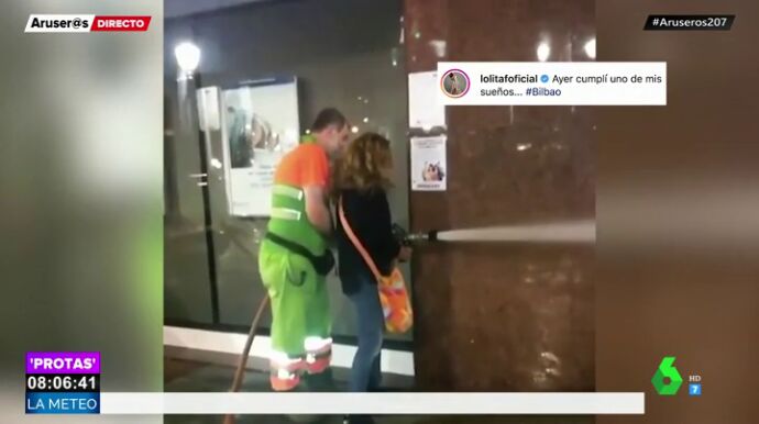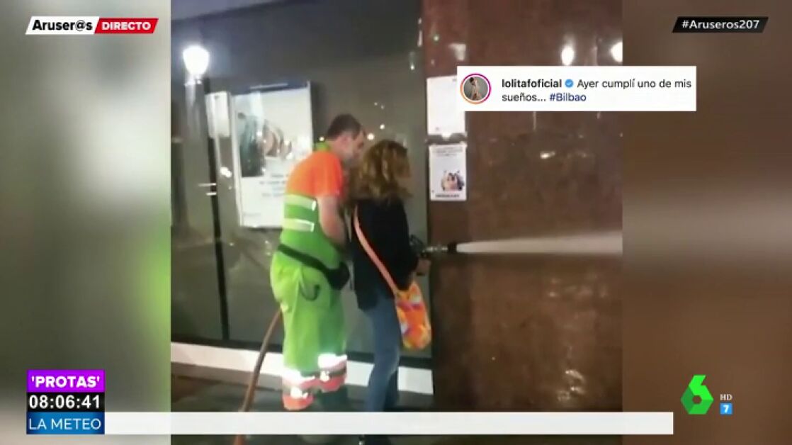 Aruser@s ha enseñado el vídeo que ha subido Lolita Flores a su cuenta de Instagram. En él se ve a la cantante, junto a un barrendero, limpiando las calles de Bilbao con una manguera.