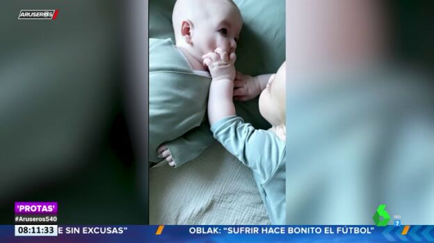 Los dos dos pequeños, de casi la misma edad, se encontraban tumbados juntos cuando Nico lanzó la mano para arañar la cara de su amigo. Un momento que ambas se han tomado con ironía y han compartido en redes sociales.