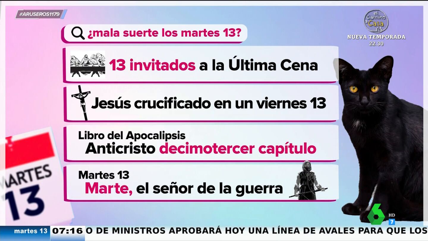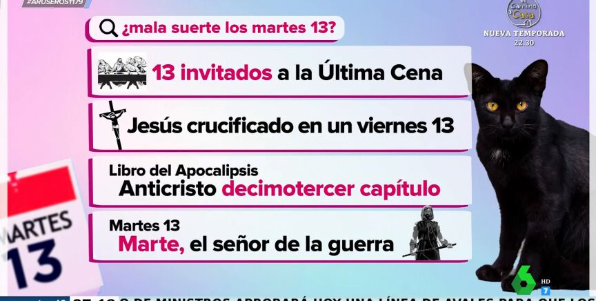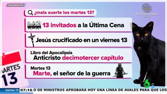 Esta superstición, nos cuenta Hans Arús en plató, viene de la fusión de dos tradiciones: la romana y la cristiana. "El cristianismo tiene tres malos augurios con el número 13: el primero, es que los invitados a la Última Cena eran 13; el segundo, es que se cree que Jesús fue crucificado un Viernes 13, y el tercero es que en el libro del Apocalipsis, en el capítulo decimotercero es cuando aparece el Anticristo". Pero, ¿por qué un martes? "Si nos vamos a la tradición romana, el dios de la guerra se conoce como Marte".