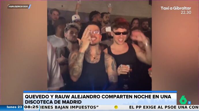 Tatiana Arús da detalles de la sorprendente aparición de Quevedoy Rauw Alejandro en una discoteca de Madrid: "Han sorprendido a los presentes que les veían compartiendo confidencias y bailando alguno de los temas del puertorriqueño", destaca Tatiana Arús, que explica que, sin duda, la gran sorpresa fue "cuando los asistentes pudieron disfrutar de un adelanto del tema del canario".