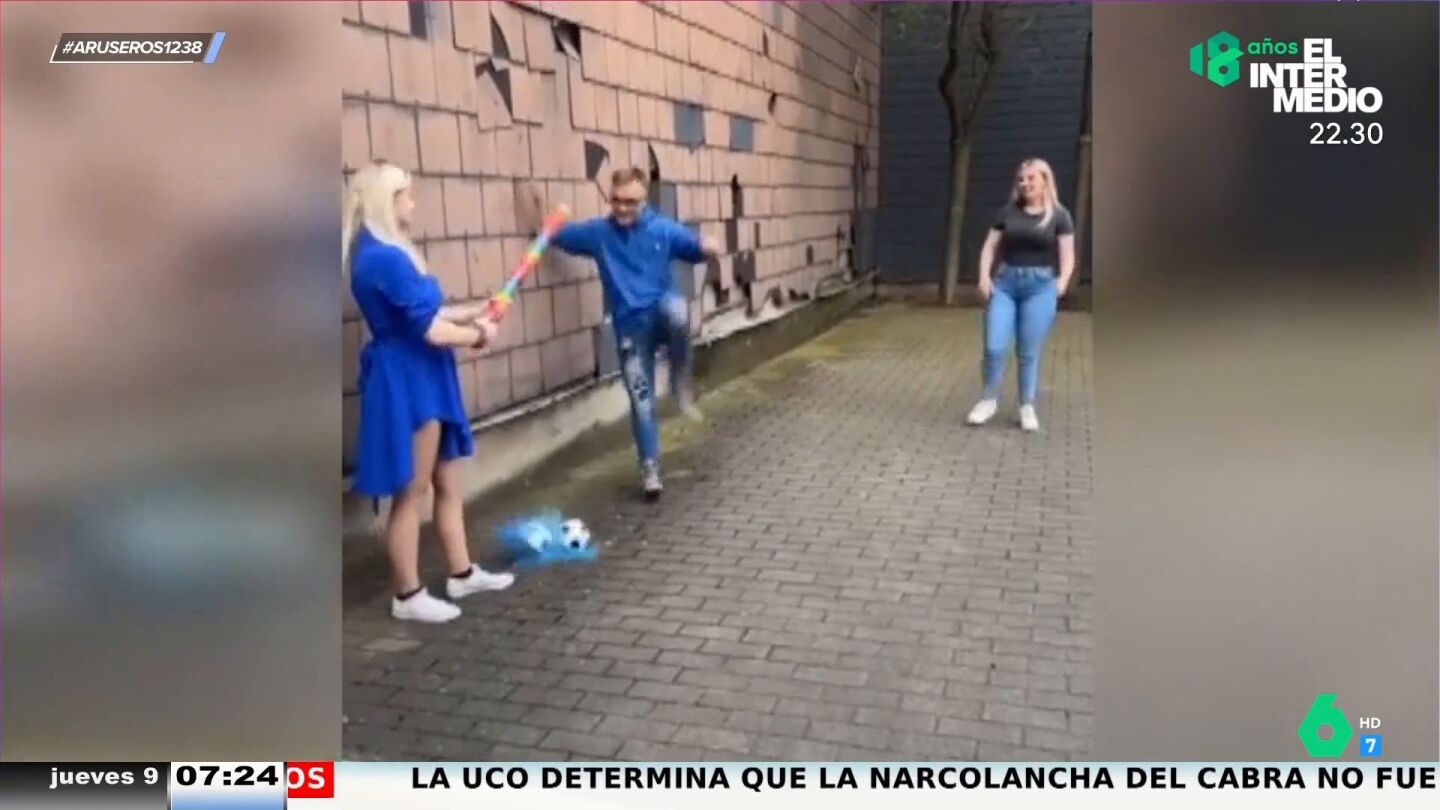 El padre quiere descubrir el género de su bebé grabando un 'gender reveal' en el que le lancen un balón, que cuando lo golpee se rompa y salga el polvo del azul o rosa. La realidad ha sido más triste. Un conocido pasa el balón para que chute, pero no consigue contactar con la pelota y el sexo se descubre al romperse la bola contra el suelo. A pesar de ello, en el vídeo se puede apreciar la felicidad de la pareja al ver que tendrán un hijo.