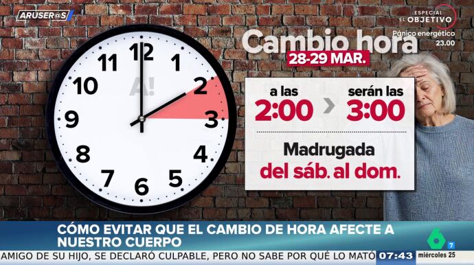 Ya quedan muy pocos días para que en España demos la bienvenida al horario de verano. En la madrugada del sábado al domingo tendrá lugar el temido cambio de hora y a las 2 h serán las 3 h, lo que supone que dormiremos menos (y que habrá una hora menos de vacaciones de Semana Santa, para quien las tenga). "Este ajuste puede alterar el ritmo circadiano", advierte Elizabeth López en Aruser@s.