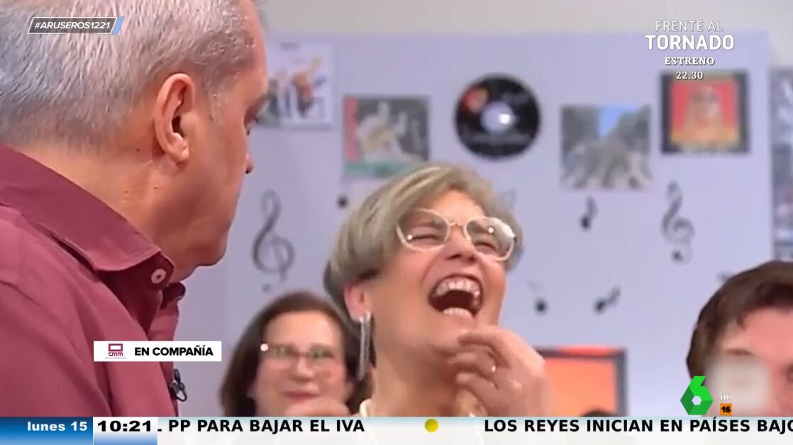 "Me hablaron mucho de ti", comienza diciendo Ramón García a la espectadora que estaba entre el público del programa 'En compañía'. "No sabes que manera de reír más contagiosa", cuenta mirando a cámara el presentador mientras la mujer comienza a reírse como si se ahogase. Ramontxu prosigue contando que no la había escuchado nunca, pero admite que le está dando un "poco de angustia". Tras estas palabras la señora suelta una carcajada que sorprende y asusta al conductor del programa.