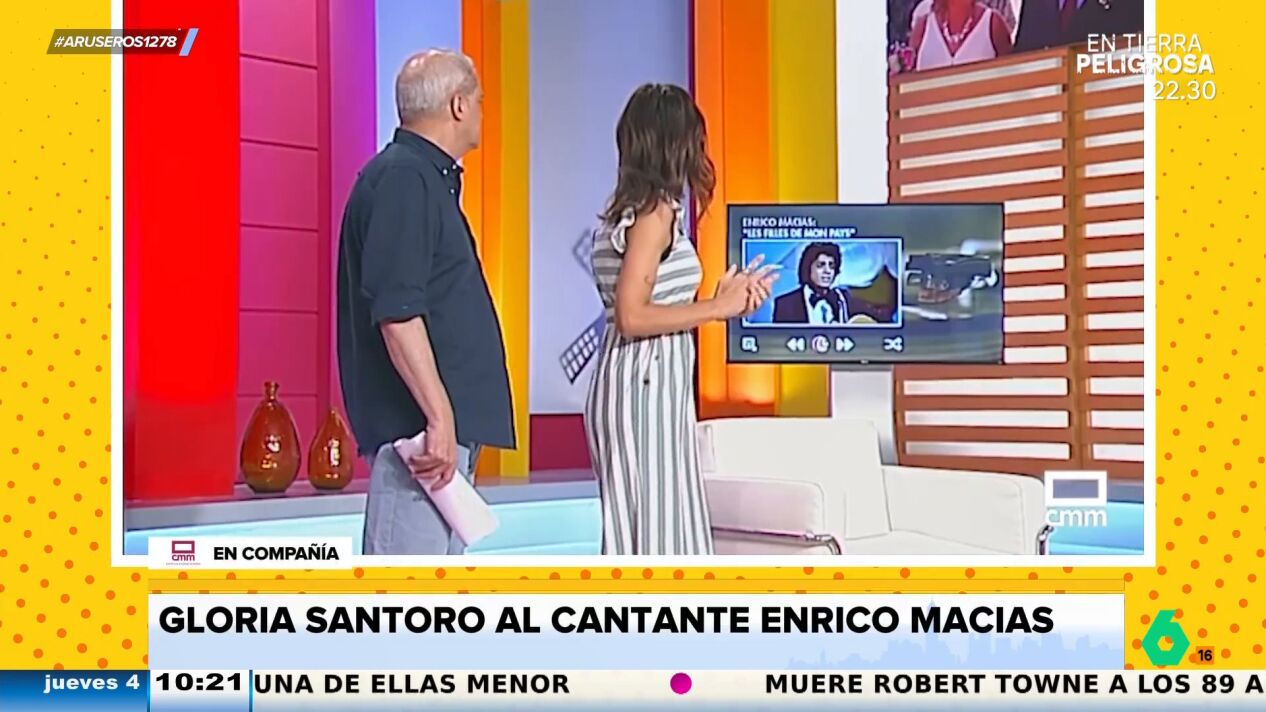 Alfonso Arús trae la última pulla de Gloria Santoro en el programa 'En Compañía' que presenta junto a Ramón García. El presentador pone en la pantalla de la televisión una foto de del cantante Enrico Macias y le dice a Gloria Santoro a ver si descubre quién es. La presentadora le responde: "Pues la voy a clavar, es Michael Jackson".