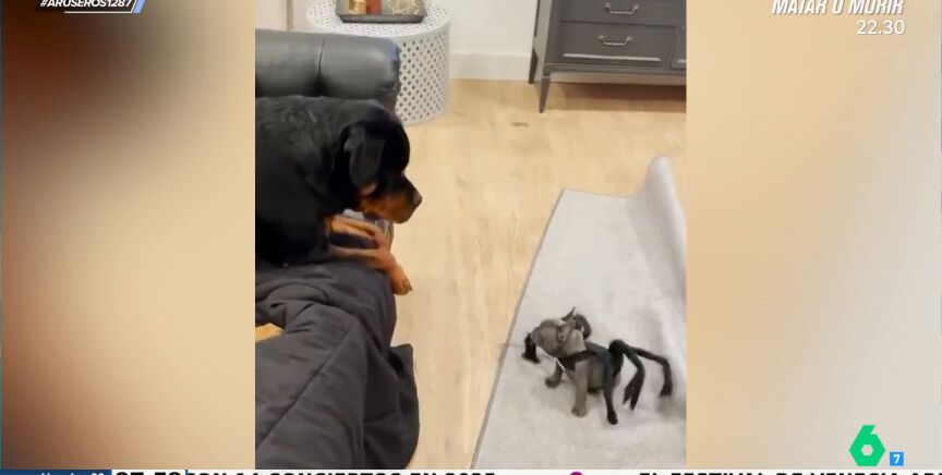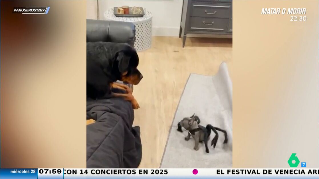 Un rottweiler entra en "modo pánico" al ver a un cachorro entrar a la sala disfrazado de araña. El perro, al principio, se muestra curioso y se acerca al cachorro; pero la valentía le dura muy poco y decide que, lo mejor, es huir de esa "perraña". Y es que así lo llama Alfonso Arús en el plató.