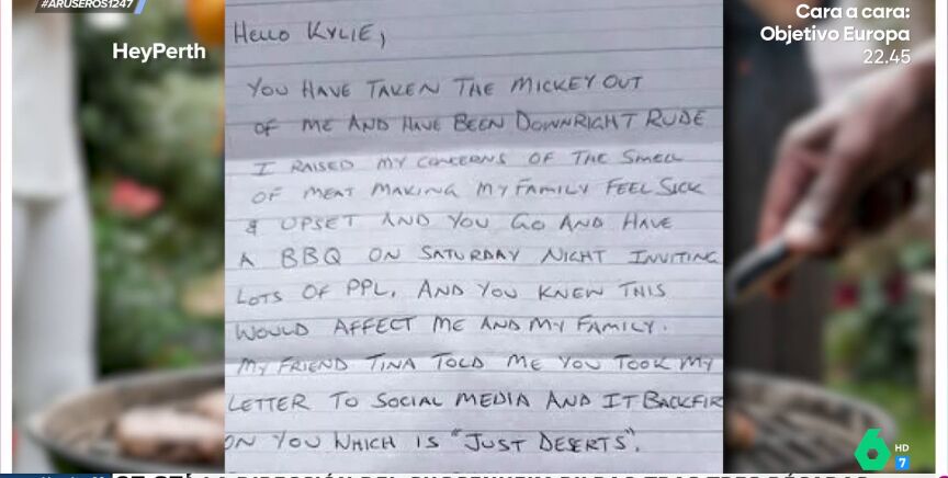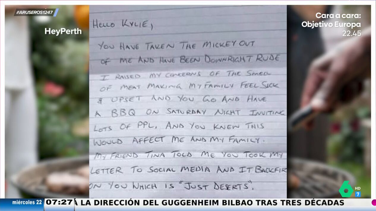 Una familia vegana ha enviado una amenaza a sus vecinos a causa de las barbacoas que hacen. El aviso llega tras una primera misiva en la que la familia pedía amigablemente que cuando hiciesen una parrillada cerrasen las ventanas. Los residentes de la casa de al lado hicieron caso omiso y decidieron enviar una segunda. Los que hacen las barbacoas la subieron a redes sociales ridiculizando su petición y tras este hecho han decido enviar una tercera carta amenazándoles. En ella, avisan que van a ir por lo legal para solucionar el problema.