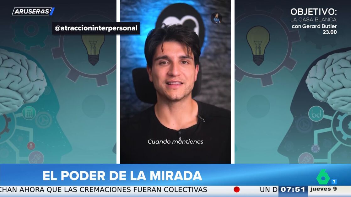 En Aruser@s han mostrado el vídeo viral de Hugo, psicólogo especializado en seducción y relaciones, quien explica que una de las claves para generar conexión está en "sostener la mirada". Para demostrarlo, propone un experimento sencillo pero incómodo: sentarse frente a un desconocido, mirarle a los ojos y no hablar durante dos minutos.