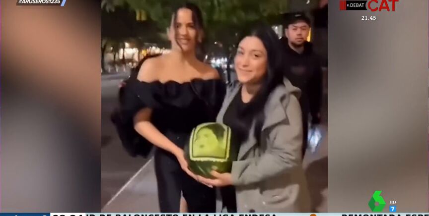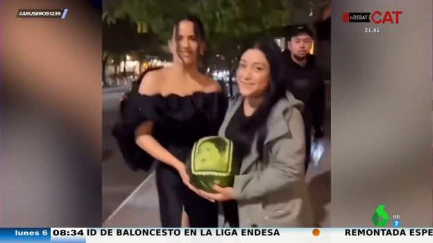 Alfonso Arús alucina al ver el momento en le que una joven regala a Rosalía una sandía en la que ha recreado su cara. "Está hinchada", afirma el presentador mientras que Angie Cárdenas y Tatiana Arús dicen que parece Frida Kahlo.